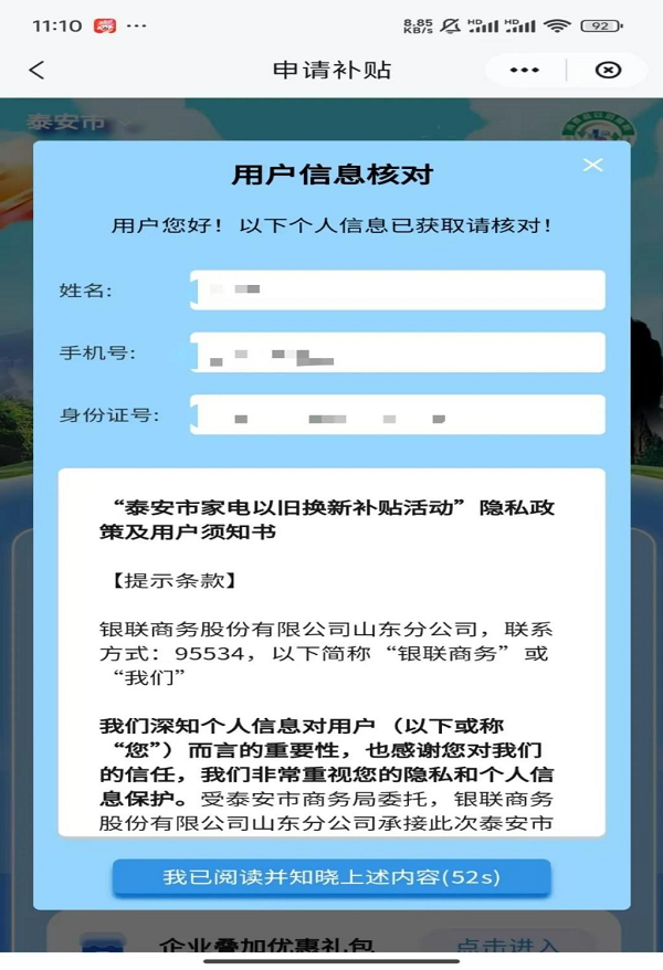 【申請(qǐng)補(bǔ)貼】用戶點(diǎn)擊進(jìn)入“家電補(bǔ)貼券申請(qǐng)”界面,系統(tǒng)彈窗提示授權(quán)申請(qǐng),用戶同意云閃付 APP 授權(quán)“魯換新”小程序獲取注冊(cè)手機(jī)號(hào)、姓名、證件號(hào)信息,進(jìn)入“用戶信息核對(duì)”界面,信息核對(duì)無誤后,點(diǎn)擊“我已閱讀并知曉上述內(nèi)容”。