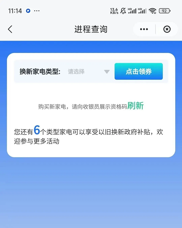 系統(tǒng)校驗(yàn)用戶的以舊換新資格,校驗(yàn)成功后,彈窗提示,用戶點(diǎn)擊確認(rèn),進(jìn)入領(lǐng)券界面,在“換新家電類型”的下拉框中選擇要領(lǐng)券的品類,點(diǎn)擊領(lǐng)券。頁(yè)面彈窗提示:“確認(rèn)要領(lǐng)取該類型的政府補(bǔ)貼券嗎?領(lǐng)取成功后將無法修改!”,點(diǎn)擊確定。領(lǐng)券成功,界面顯示以舊換新資格碼。